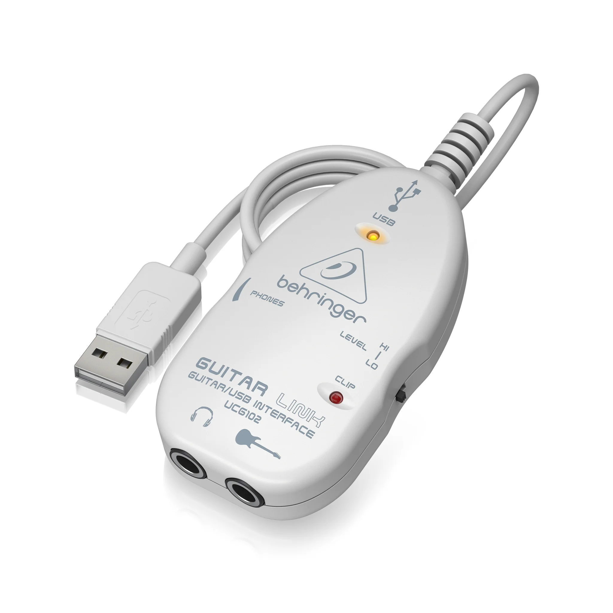The UCG102 is a USB interface that, like a guitar amp, receives signal from your guitar via a ¼ " input jack. A built-in USB cable then sends the signal directly to your computer, in addition to tracking your latest masterpiece. It has a ¼ " headphone jack and Phones volume dial so you can monitor your performance as you record, a Clip LED to tell you when your signal is too hot, and a Hi/Lo level selector.